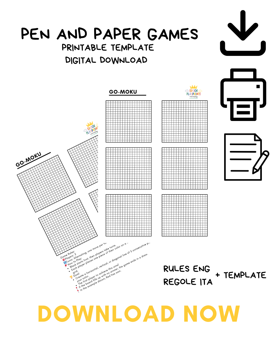 Rivivi il divertimento dei giochi di carta e penna con questo classico GO-MOKU stampabile, pronto da scaricare, stampare e giocare in pochi minuti.