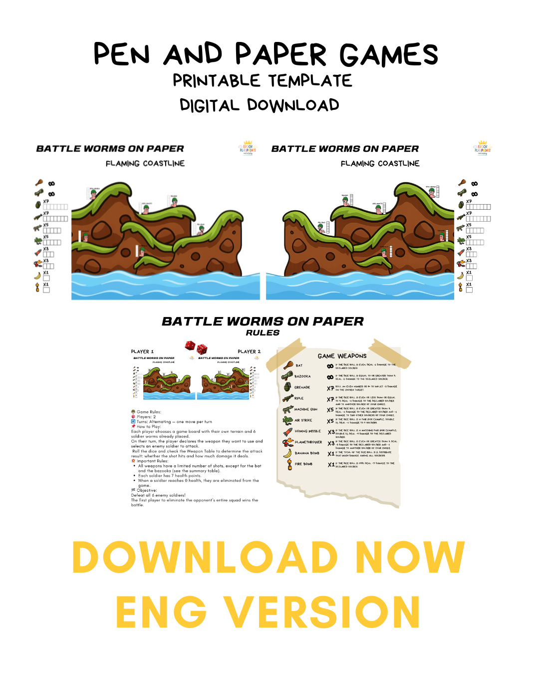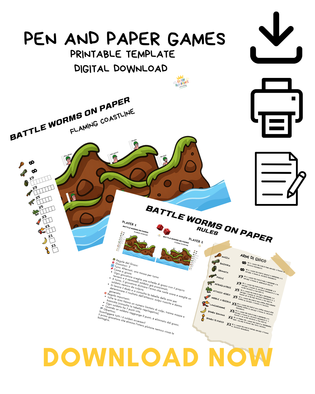 Rivivi il divertimento dei giochi di carta e penna con questo classico BATTLE WORMS ON PAPER stampabile, pronto da scaricare, stampare e giocare in pochi minuti. È un’attività semplice e strategica che bambini e famiglie possono apprezzare a casa, in viaggio o anche in classe. Il gioco è disponibile in formato PDF di alta qualità in A4 con un tabellone in stile classico pensato per due giocatori. Non serve alcuna preparazione: basta stampare, prendere una penna e iniziare subito la partita. I giochi di carta e penna stampabili sono l’alternativa perfetta all’intrattenimento digitale: stimolano logica, pianificazione e attenzione, e sono ideali da portare in viaggio, in sala d’attesa o da giocare in famiglia per passare momenti divertenti insieme. BATTLE WORMS ON PAPER è gratuito, non richiede alcun account ed è l’introduzione perfetta alla nostra collezione in continua crescita di giochi stampabili per bambini e famiglie.