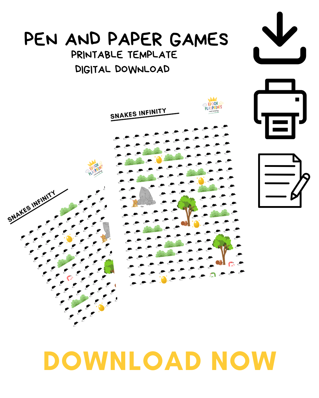 Bring back the fun of pen and paper games with Snakes Infinity, the upgraded version of the classic Snake, ready to download, print and play. With a bigger map, new obstacles, the Pac-Man effect (exit one side and re-enter on the other), and golden eggs that let your snake rest for one turn, every match becomes more strategic and exciting.This printable game is simple yet engaging, perfect for kids, families and classrooms, whether at home, while traveling, or for quick challenges anywhere. The package includes a high-quality PDF template in A4 format with an extended game board and special rules. It is designed for two players and requires no preparation: just print and play.Snakes Infinity offers screen-free entertainment for children and families, boosts logic, planning and strategic thinking, and works great as a classroom activity or travel game. Setup is quick and easy: all you need is pen, paper and fun. Click “Add to Cart” and receive your instant PDF file, and discover the joy of printable pen and paper games with Snakes Infinity, part of the growing PlayPrintsGame collection.