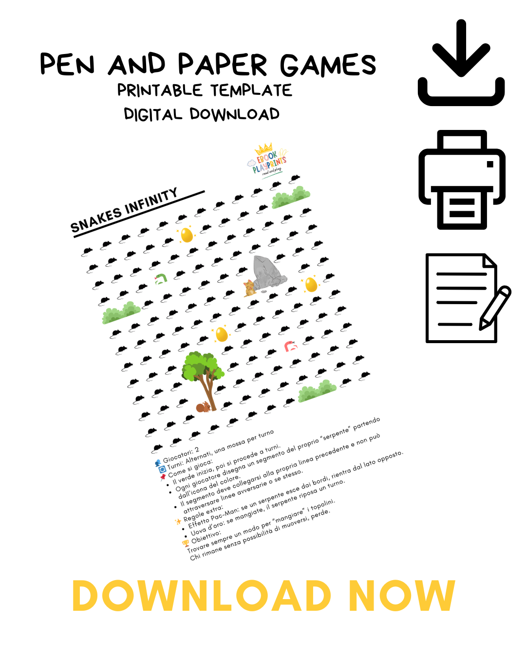 Rivivi il divertimento dei giochi carta e penna con Snakes Infinity, la versione evoluta del classico Snake, pronta da scaricare, stampare e giocare. Con una mappa più grande, nuovi ostacoli, l’effetto Pac-Man (esci da un lato e rientri dall’altro) e le uova d’oro che fanno riposare il serpente per un turno, ogni partita diventa più strategica e sorprendente.Un’attività semplice e coinvolgente per bambini, famiglie e insegnanti, perfetta a casa, in viaggio o a scuola. Il pacchetto include un file PDF ad alta qualità in formato A4 con un tabellone stampabile esteso e le nuove regole speciali. È pensato per due giocatori e non richiede alcuna preparazione: basta stampare e iniziare a giocare.Snakes Infinity è un intrattenimento senza schermi che allena logica, pianificazione e strategia, ideale come gioco da viaggio o come attività didattica. Le partite sono rapide, semplici e divertenti, e tutto ciò che serve è carta, penna e tanta voglia di sfidarsi. Clicca su “Aggiungi al carrello” e ricevi subito il tuo file PDF. Scopri il divertimento dei giochi di carta e penna stampabili con Snakes Infinity, parte della collezione PlayPrintsGame.