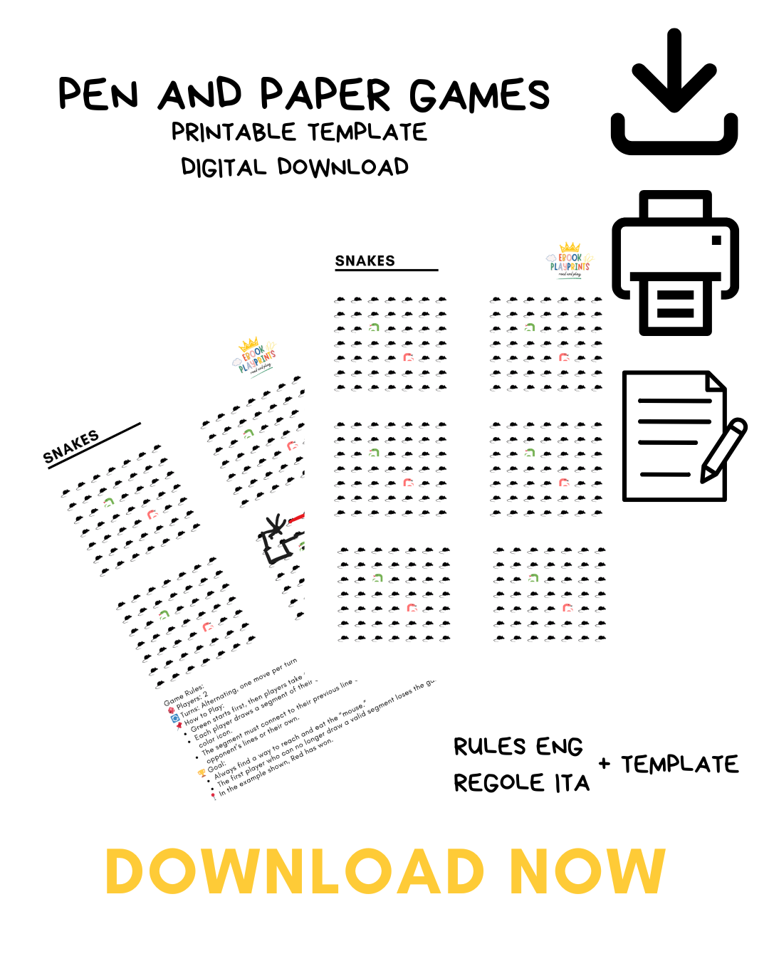 Rivivi il divertimento dei giochi di carta e penna con questo classico SNAKES stampabile, pronto da scaricare, stampare e giocare in pochi minuti.